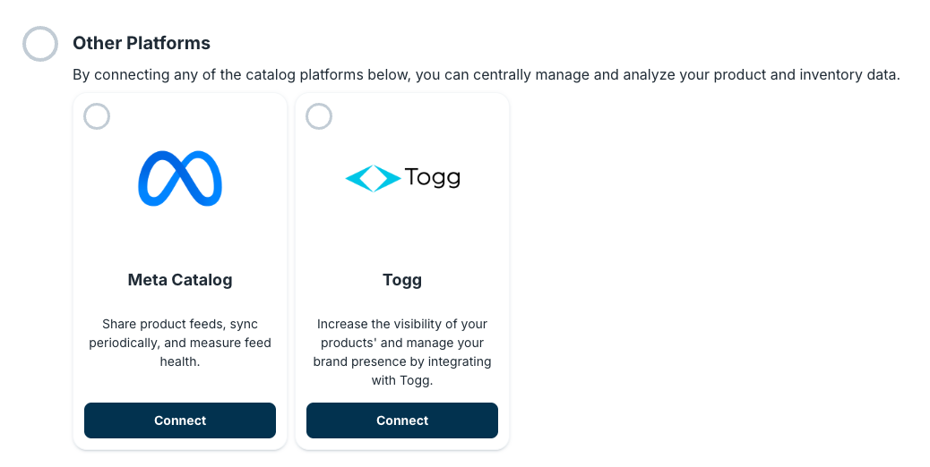 ‘Other Platforms’ kısmının altında META Catalog ve TOGG için ‘Connect’’ butonuna tıklayarak ilgili diğer platformları VenueX panele bağlayın.